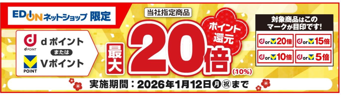 エディオンネットショップの新春特別企画では、当社指定商品にdポイントまたはVポイントが最大20倍還元されます。普段からこれらのポイントを利用している方には、大変お得な購入機会です。