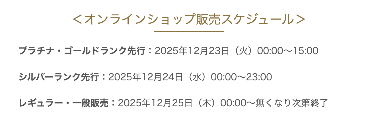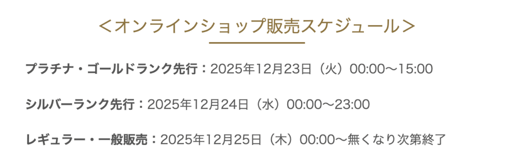 ※オンラインショップは2025年内に販売開始で、すでに完売、また会員ランクにより販売期間が異なりました。