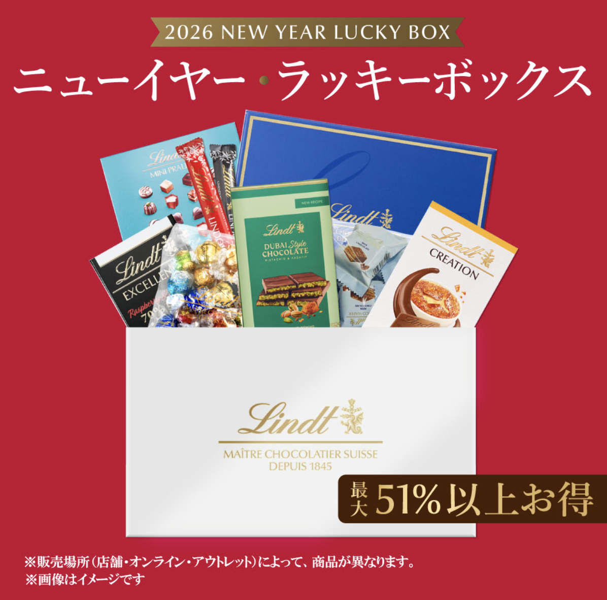 公式発表によると、直営店の福袋(ニューイヤーラッキーバッグ)は最大50%以上お得とされています。内容にはリンドール、チョコウェイファー、ショコラスイーツが含まれ、一部にはドバイチョコレートも入ると案内されています。