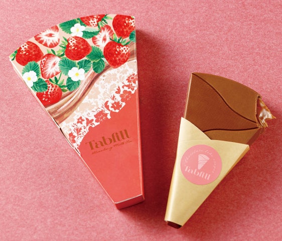 「タブレットチョコレート」と「fill(満たす)」を組み合わせた〈メリーチョコレート タブフィル〉。クレープ型のチョコレート「ストロベリーミルクティー」は、甘酸っぱいストロベリーソースとまったりとろけるミルクティーガナッシュが絶妙なハーモニーを奏でます。