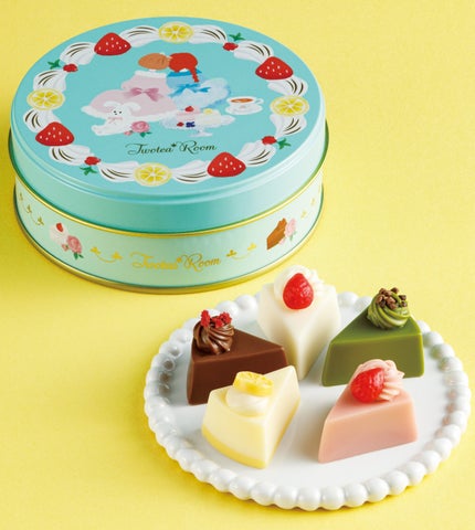 “ヌン活”を楽しむアフタヌーンティーをコンセプトにした〈トゥーティールーム〉。いちごやレモン、クリームで彩られた丸缶に、5種類のケーキを模したミニチュアチョコレートを詰め合わせました。