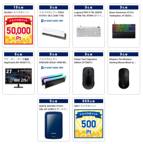 最大5万円分のドスパラポイント、または人気PCパーツ・周辺機器 |