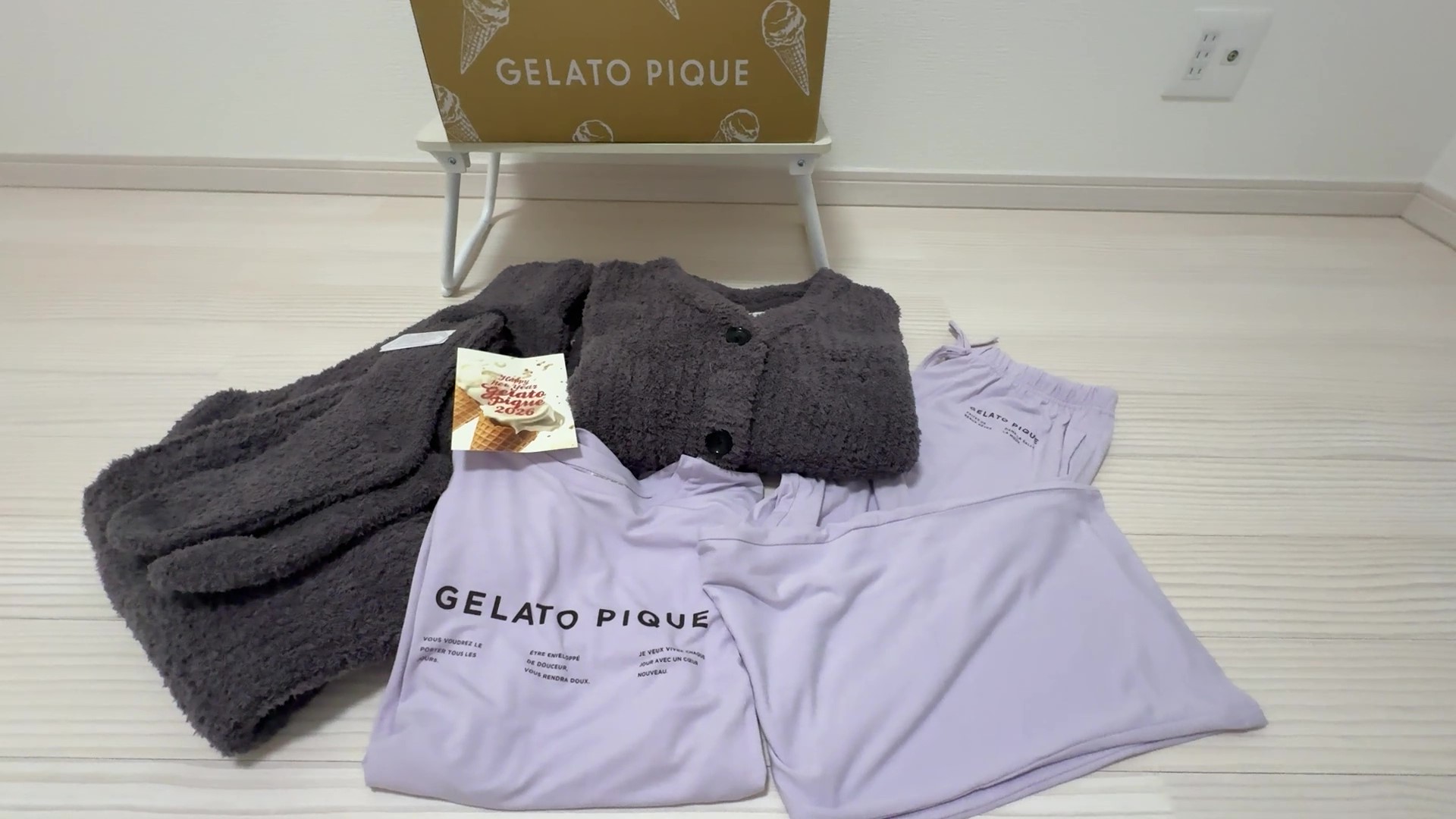 薄手アイテムは可愛らしいラベンダーカラーですが、もこもこアイテムが濃いグレーのため、全体としては落ち着いた雰囲気です。