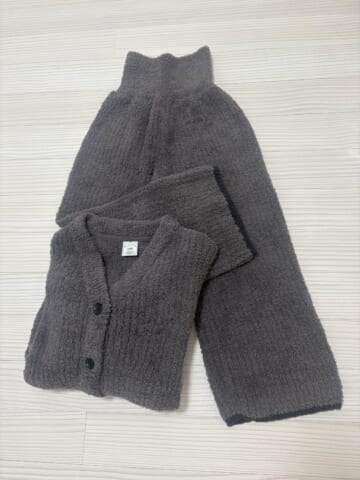 もこもこアイテムがジップやフードではなく“ボタンのカーディガン型”であるため、就寝時に首元がごわつきにくく、手持ちの薄手ウェアとも合わせやすい利点があります。