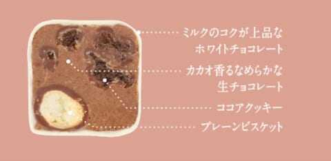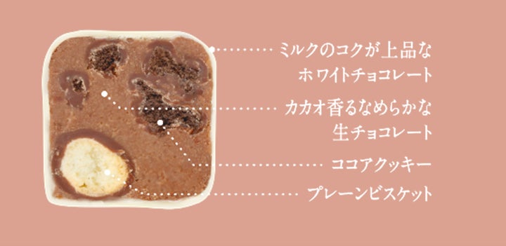 ベルギー製造のミルクチョコレートを贅沢にコーティングチョコレートに使用し、リッチなカカオの風味と深みのある味わいを実現しました。自社製造のチョコレートケーキのしっとりとした食感と、さくっとほろほろの口どけの良いココアクッキーが特徴です。さらに、ミルク感豊かな北海道生クリームを使用したパウダーを練り込み、豊かなコクとまろやかさを加えています。