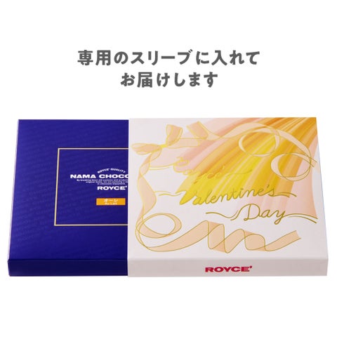 ロイズの生チョコレート人気No.1の[オーレ]をはじめとする、10種類の生チョコレートから好みの味を選べます。こちらにも「Royce’ Valentine’s Day」の文字をあしらったLINEギフト限定スリーブを付けて届けます。
