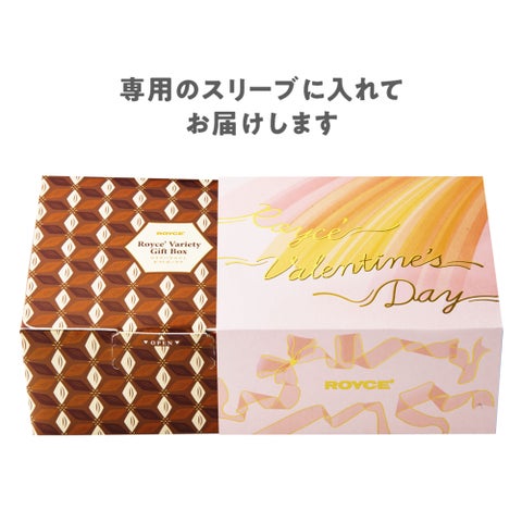 「ロイズバラエティギフトボックス」には、バレンタイン限定のスリーブ付きバージョンも用意されています。「Royce’ Valentine’s Day」の文字をあしらった限定スリーブで、バレンタインの贈り物に華やかさを添えます。