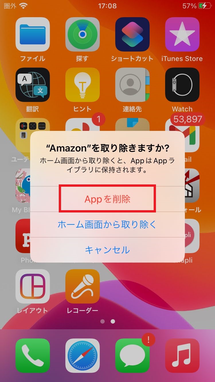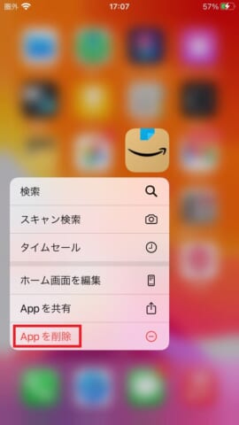 - iPhoneのホーム画面で、Amazonアプリのアイコンを長押しします。