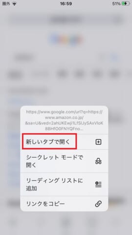 - Chromeの場合: 「新しいタブで開く」をタップします。