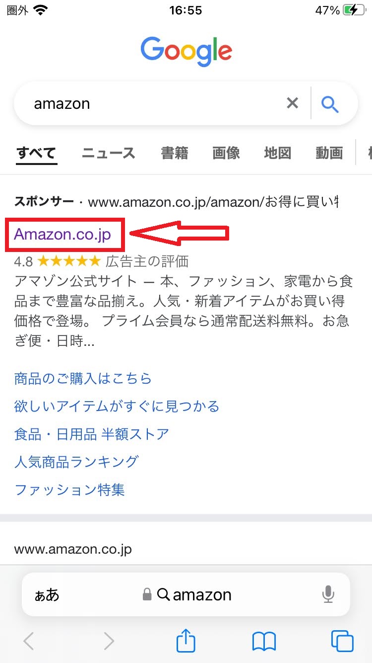 検索結果に表示されるAmazon公式サイトへのリンクを探します。