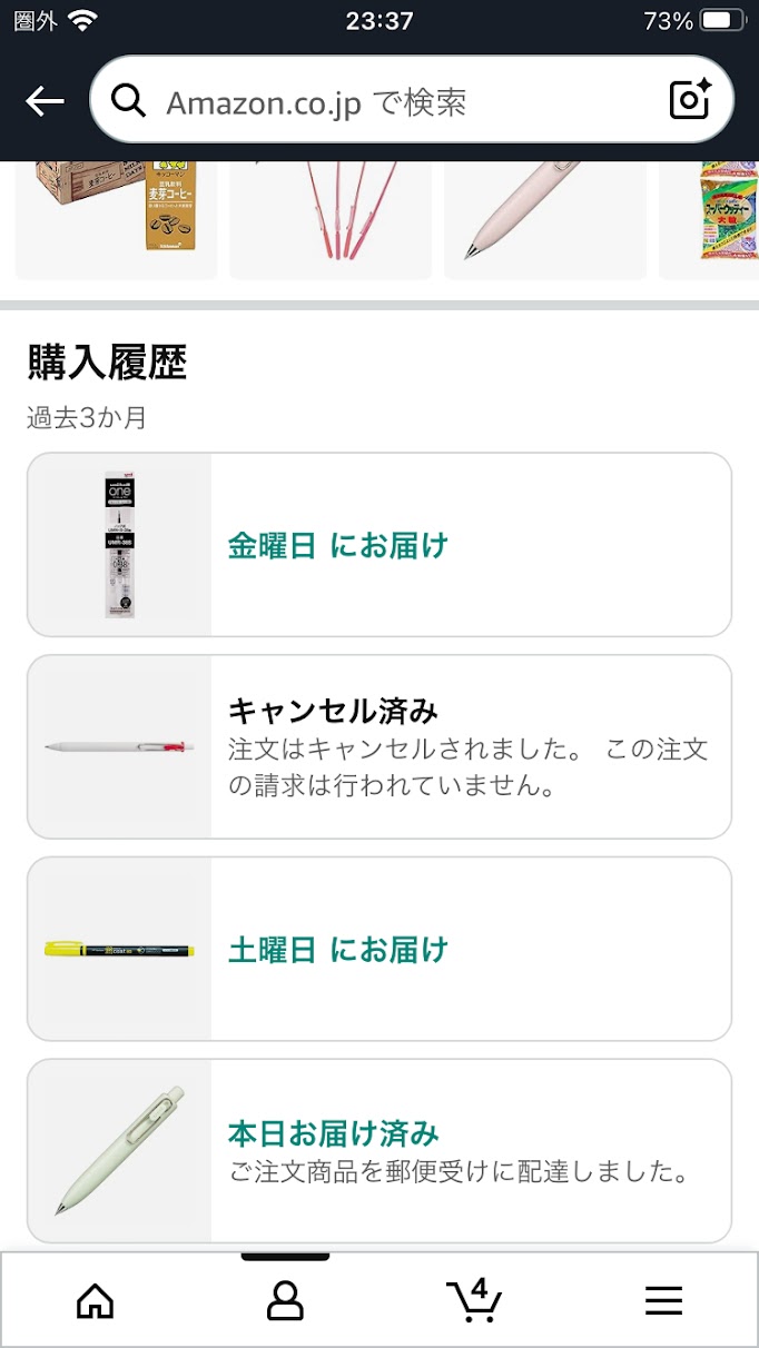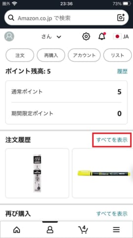 ▼注文履歴の画面。ここから領収書を発行したい注文をタップ