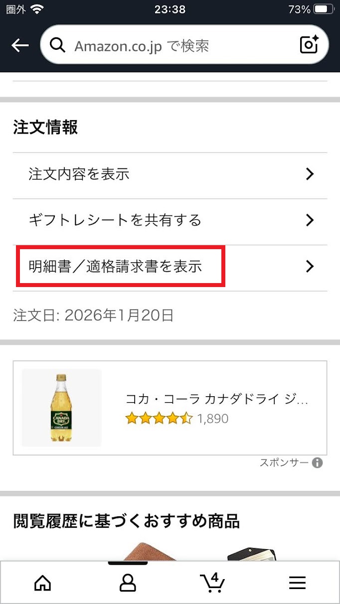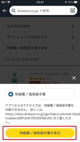 - 注文情報の項目にある「明細書/適格請求書」をタップ