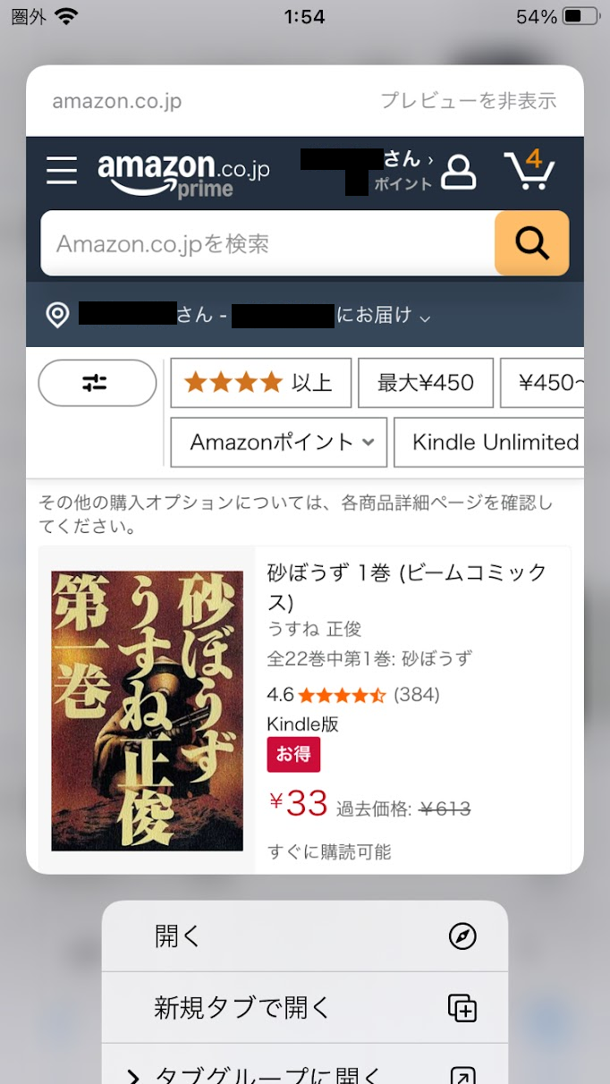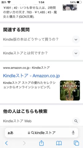 - ブラウザで「Kindleストア」と検索し、リンクを長押しして「開く」または「新しいタブで開く」