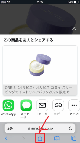 - 画面下部にある、四角に上向き矢印が描かれた「共有」アイコンをタップします。