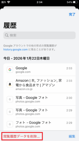 - 「履歴」>「閲覧履歴データを削除」をタップ