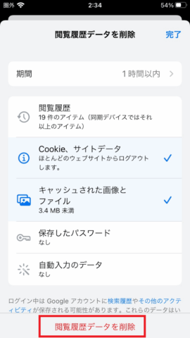 ▼「Cookie、サイトデータ」と「キャッシュされた画像とファイル」にチェックが入っていることを確認し、「閲覧履歴データを削除」をタップ