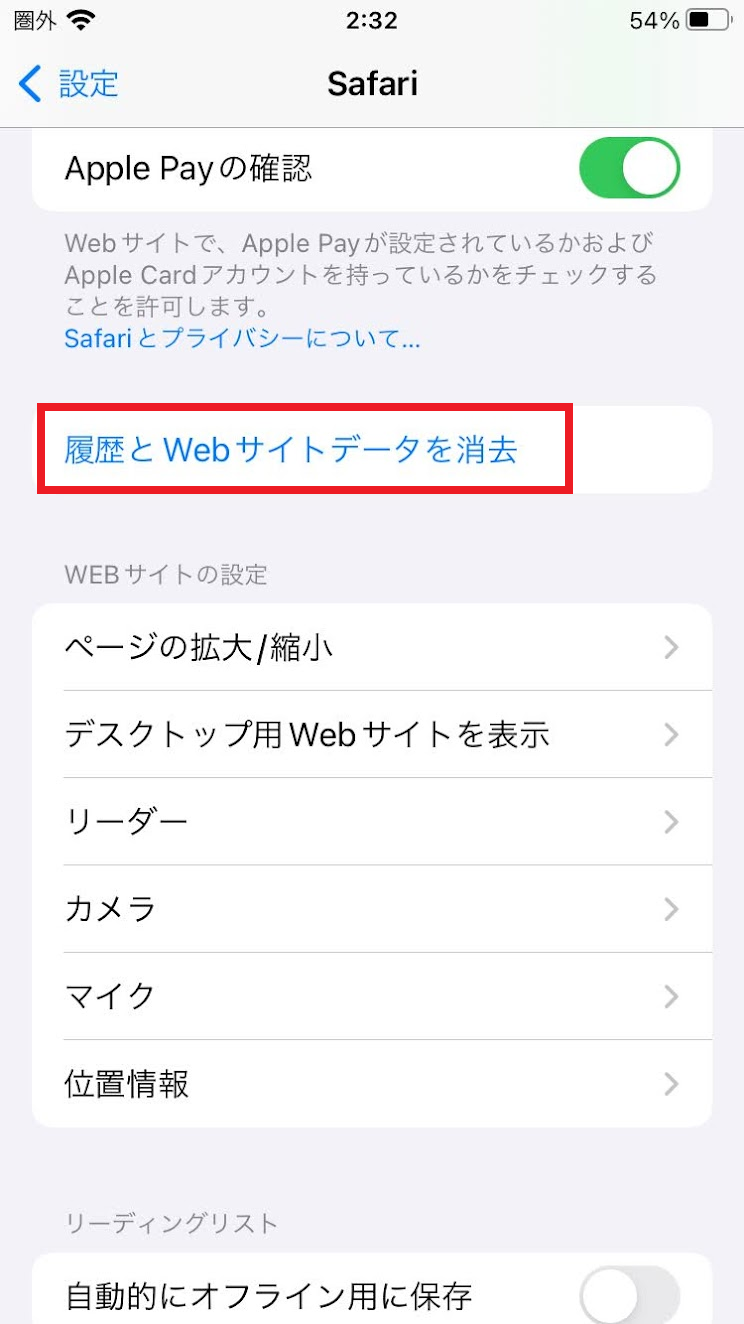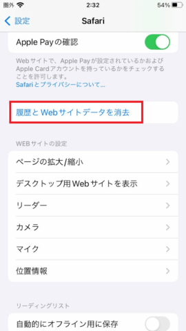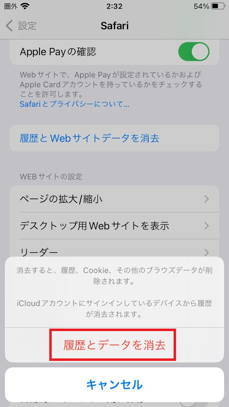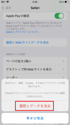 - 「履歴とWebサイトデータを消去」>「履歴とデータを消去」をタップ