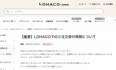 LOHACO(ロハコ)は、ランサムウェア感染によるシステム障害からの復旧を経て、2026年1月20日15時より注文受付を再開しました。約3カ月のサービス停止期間を経ての本格復旧となります。