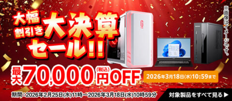 マウスコンピューターでは「大決算セール!!」を2026年2月25日(水)11時より開催中です。最大70,000円OFFでゲーミングPCやクリエイターPCなどをお得に購入できます。開催内容や参加方法を詳しく紹介するのでぜひ参考にしてください。