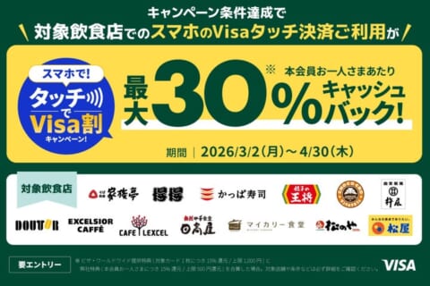 2026年3月2日から、対象の飲食店で最大30%還元を受けられる「スマホで!タッチでVisa割キャンペーン」が始まりました。スマホのVisaのタッチ決済を利用することで、日々の食事が非常にお得になります。開催内容や参加方法を詳しく紹介するのでぜひ参考にしてください。