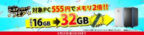 ドスパラは2026年4月24日より、対象PCのメモリ増設などが555円で可能な「ゴーゴーゴールデンウィークフェア2026」を開催します。最大5万ポイントが当たる抽選も行います。詳細を紹介するのでぜひ参考にしてください。
