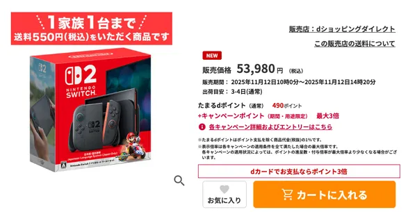 Switch2がdショッピングで先着販売中!dポイント最大4台、1家族1台&送料550円対象品で受付中