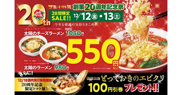 2025年12月9日 11:18トマトラーメン専門店「太陽のトマト麺」は、創業20周年を記念し、12月12日・13日... -