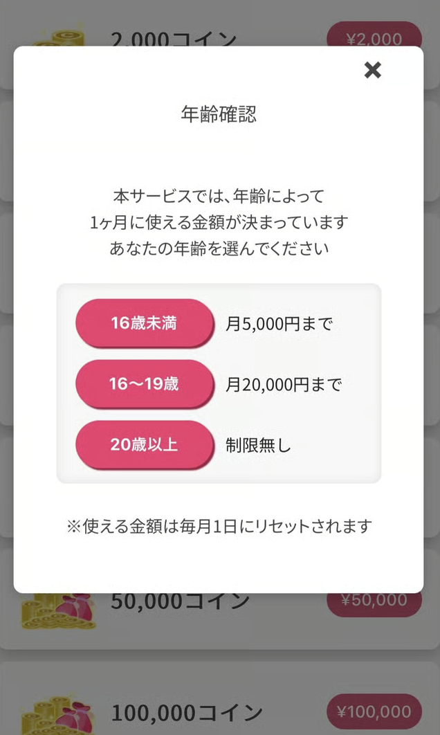 オリくじでは安心してサービスを遊べるように、年齢によって1ヶ月に使える金額定められています。