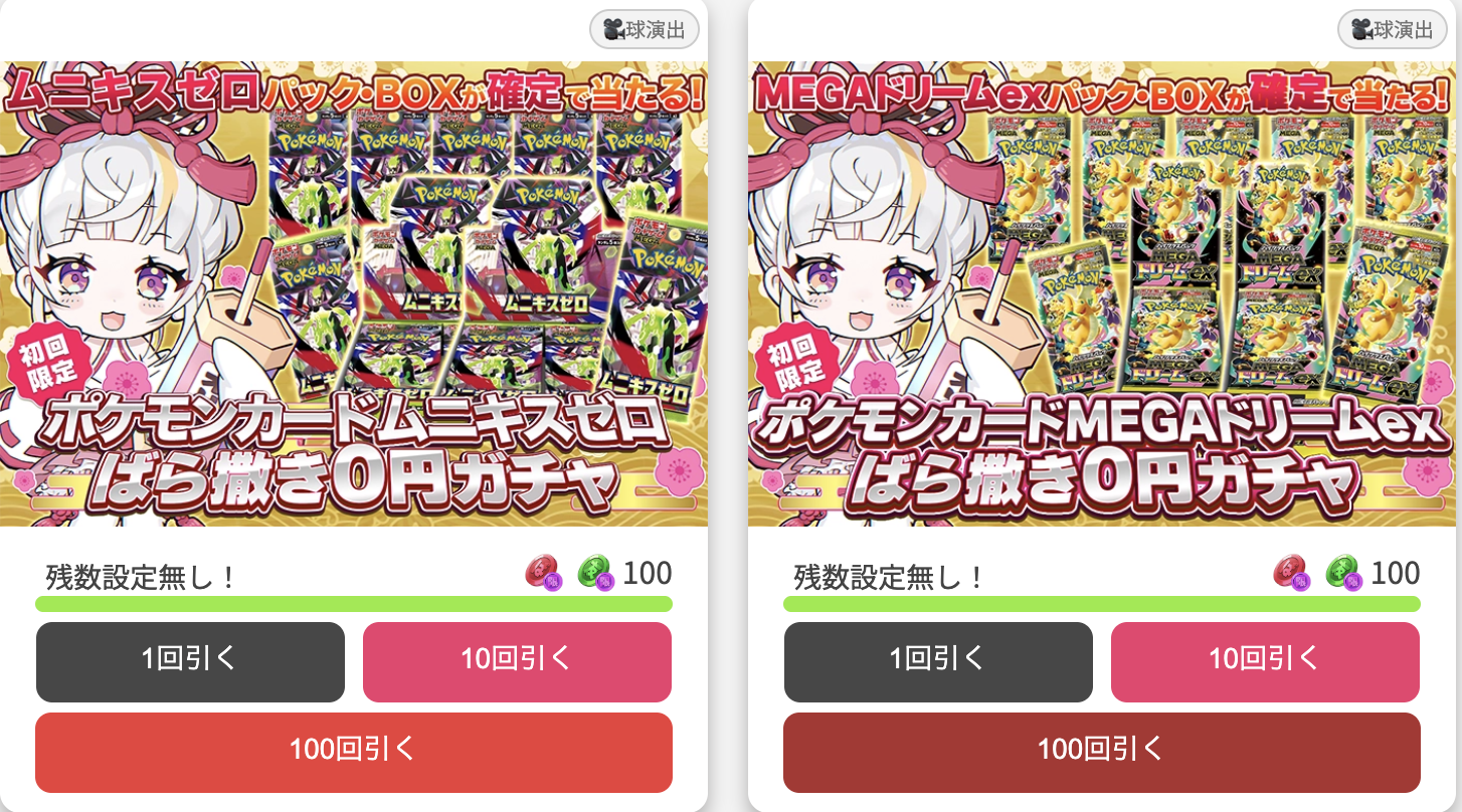 このガチャは、新規登録後に電話番号認証を完了したユーザーなら誰でも1回だけ無料で引ける特別なもので、10種類以上のラインナップから好きなガチャを選べ、ポケモンカードやワンピースカードなどのパックやBOXが必ず当たります。