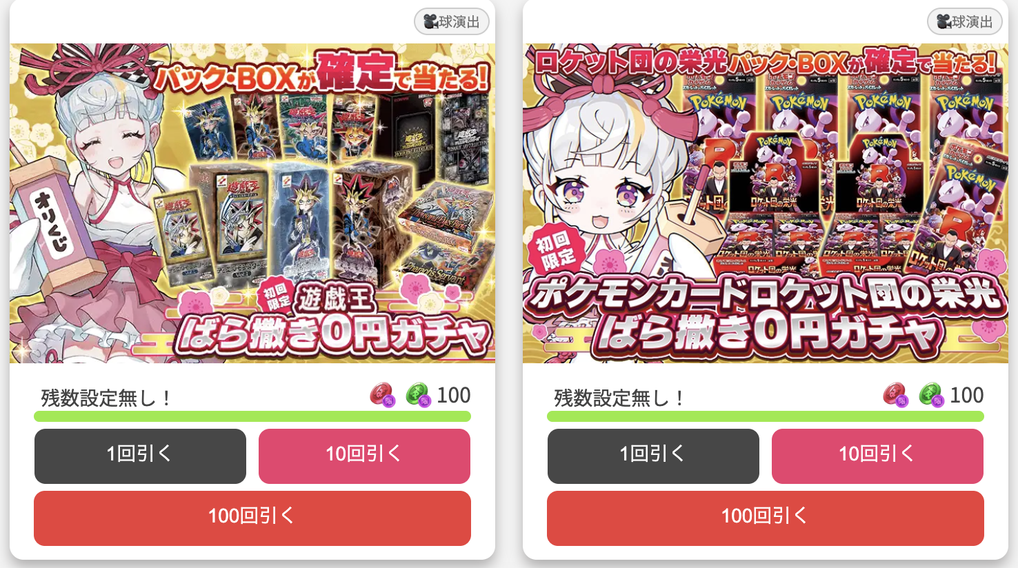 パックやBOXが当たるガチャやポイントループガチャなどがあるので、自分の好きなガチャを選んで引きましょう。