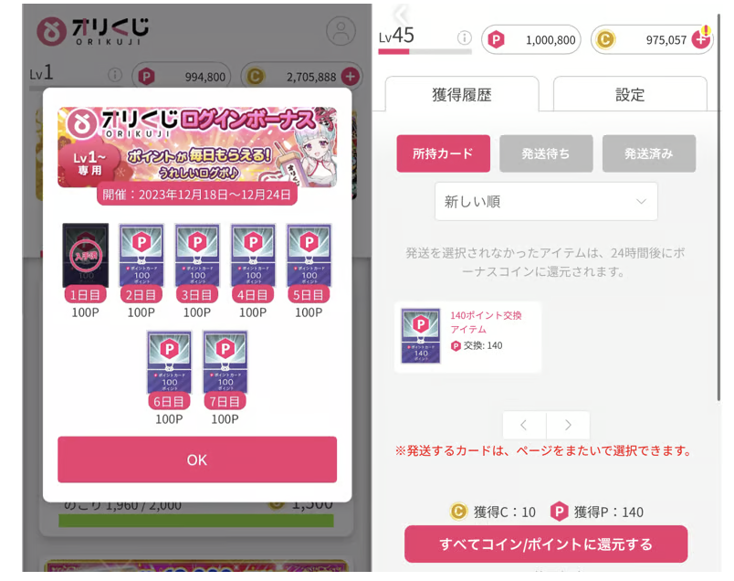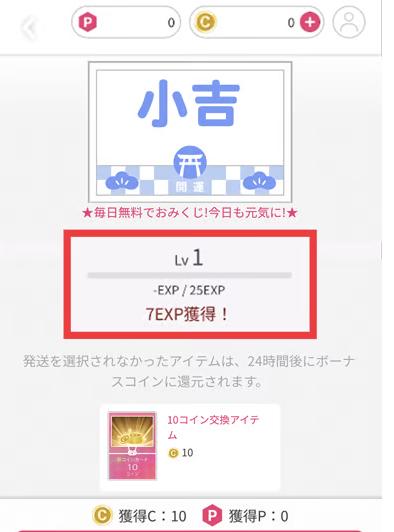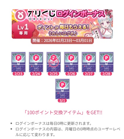 オリくじには、ポイント専用のガチャがあり、毎日ログインボーナスでポイントがもらえるため、実質無料でガチャを引くことができます