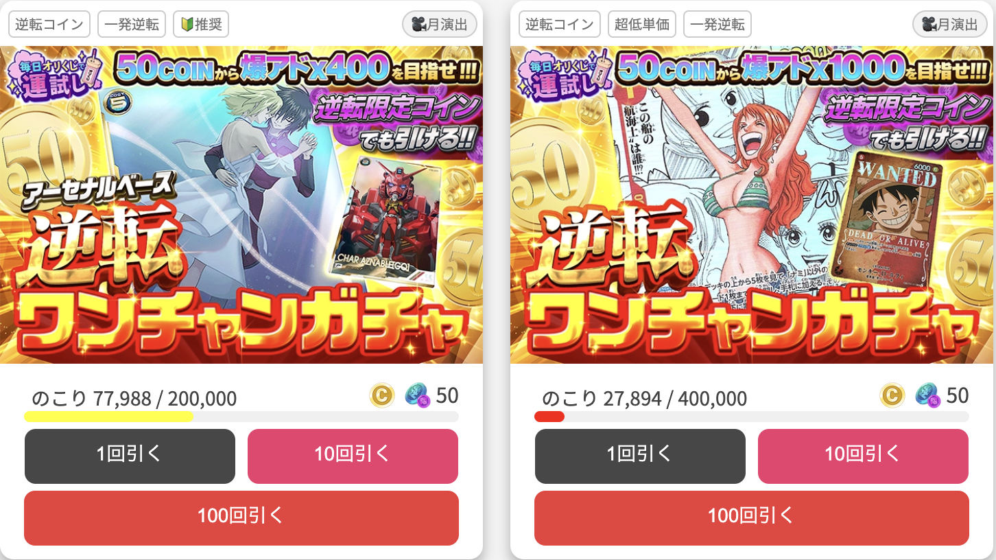 また、ログインボーナスで手に入る「逆転限定コイン」を使えば、高額カードが当たる可能性のある「逆転ワンチャンガチャ」も引けます。