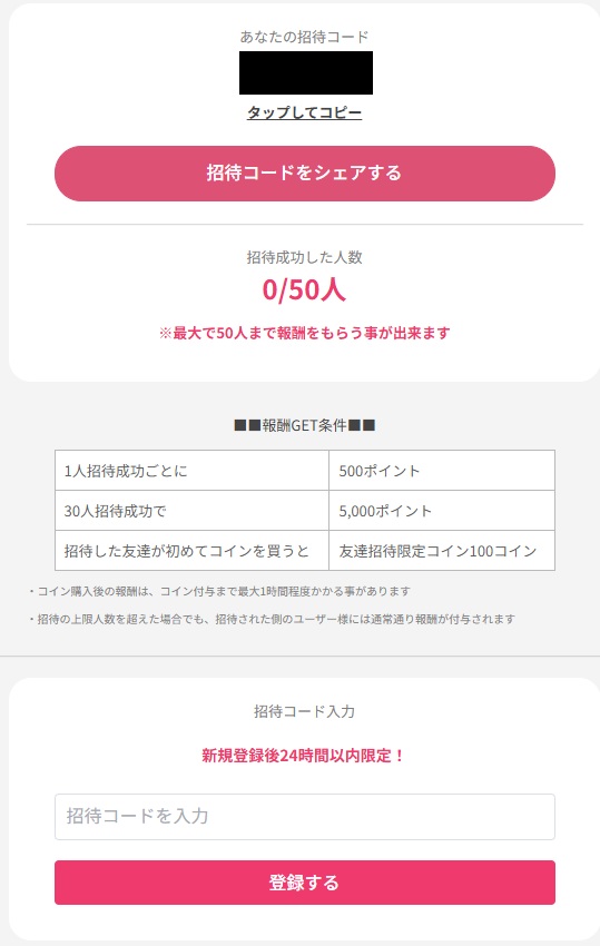 さらに、新規登録後24時間以内に招待コードを入力すると、500pt(500円相当)がもらえます。