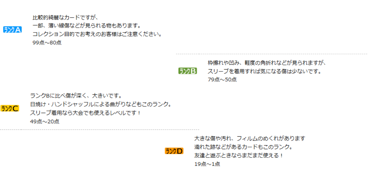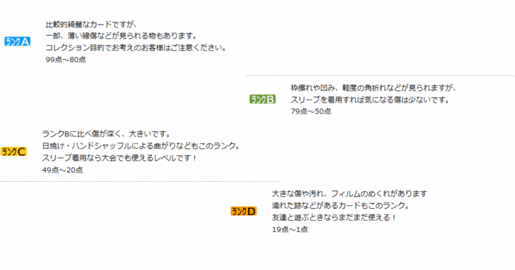カーナベルでは、カードの状態を独自の基準でランク分けし、販売しています。