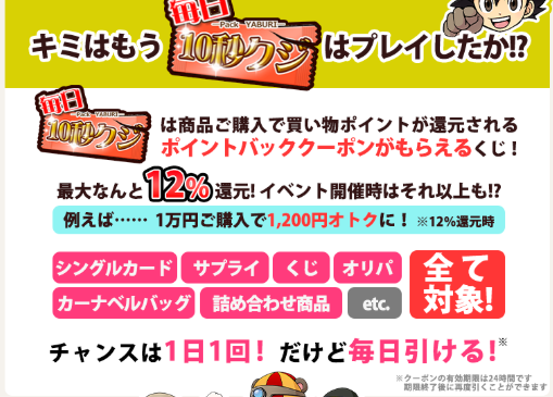 毎日引く事のできる「10秒くじ」でポイントバッククーポンを獲得して、ポイント還元率を決めます。