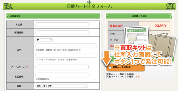 • 買取キット: 無料の専用買取キットが提供され、郵便局による集荷または持ち込みが可能です。