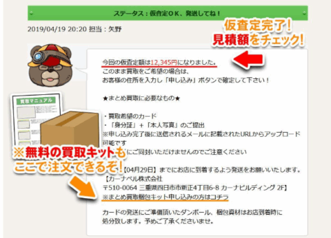• 査定時間: カード到着後24時間以内に査定結果が連絡されます(最短1時間程度)。