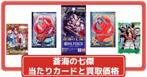 ワンピースカードゲームのブースターパック第14弾「蒼海の七傑」の当たりカードや買取価格を紹介しています。レアリティ毎の価格や封入率についても掲載しているので、ぜひ参考にしてください。