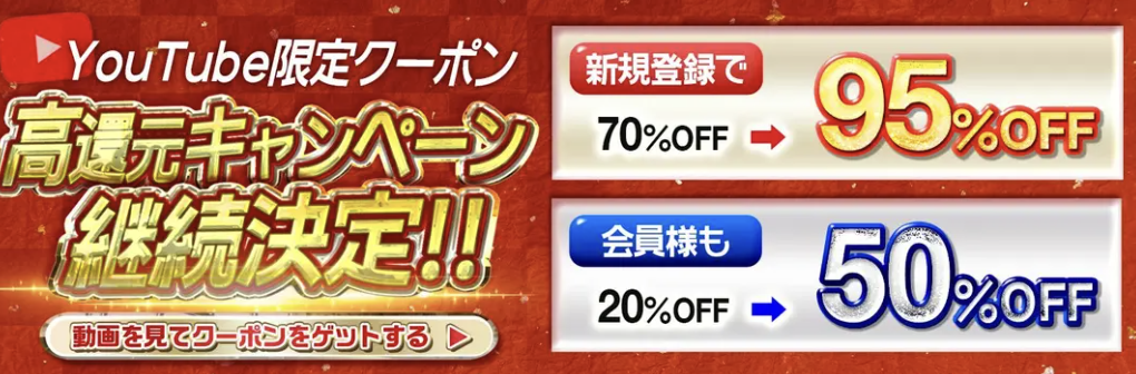 期間限定で高還元キャンペーンが開催され、新規会員には70%オフ→95%オフ、既存会員には20%オフ→50%オフになっております。Youtubeは毎日投稿されているので見逃さないようにしましょう。
