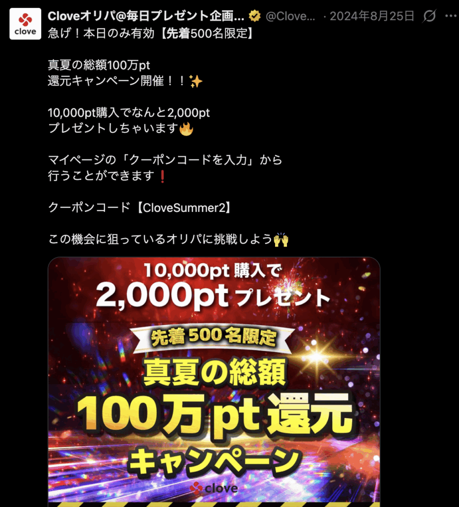 cloveオリパの公式Xアカウントでは、過去にはトレカのBOXやクーポンコード、ポイントが当たるプレゼント企画を頻繁に実施しています。リポストやいいねで抽選に参加するタイプや、ポストに記載されたクーポンコードを先着で利用するタイプがあります。見逃さないためにも、公式Xをフォローし、通知をオンにしておくと良いでしょう。