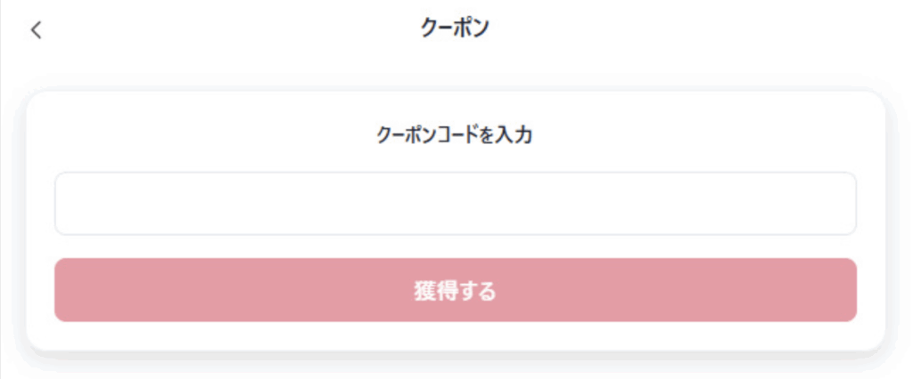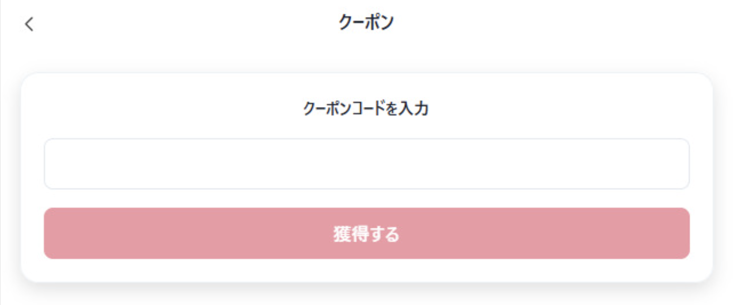 - 表示された入力画面にクーポンコードを入力し、「獲得する」を選択すると特典が付与されます。割引クーポンは、購入時に選択して適用します。