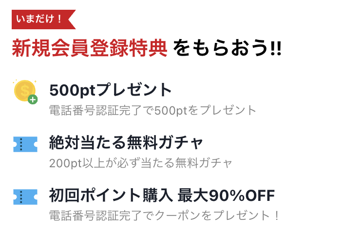 cloveに初めて会員登録しSMS認証を完了すると、初回購入時にポイントが最大90%オフになる割引が自動的に適用されます。500ptを50円で購入できるなど、少額からCloveオリパを試したい方に最適な特典です。