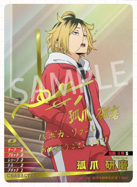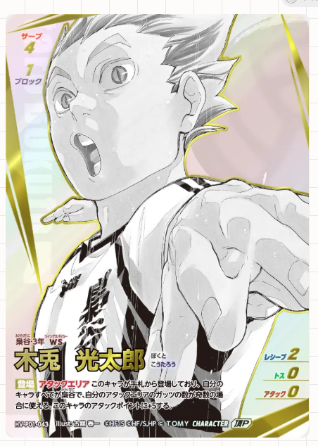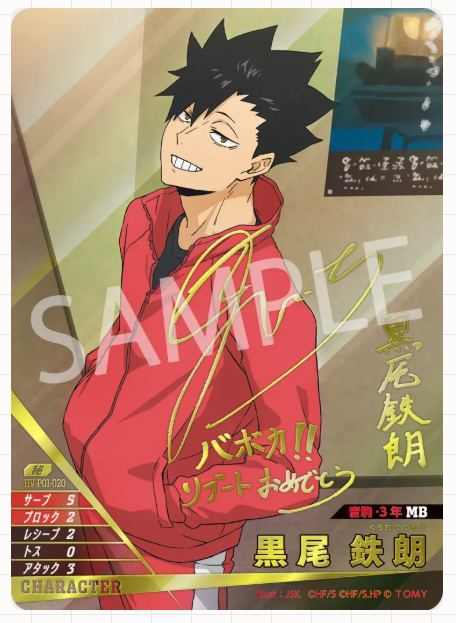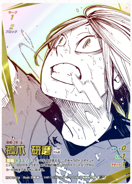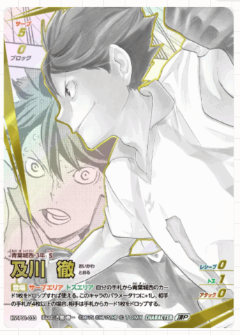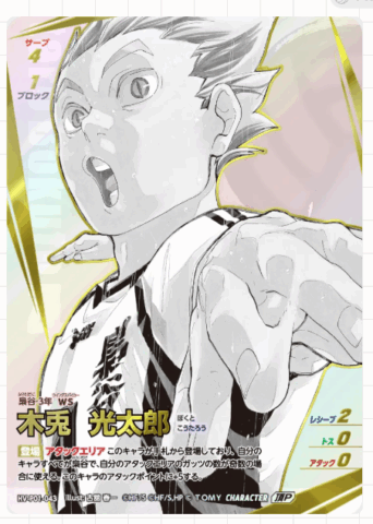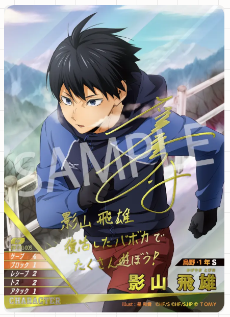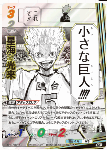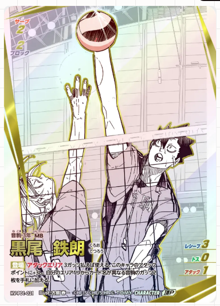 ブースターパック「ゴミ捨て場の決戦」の大当たりカードは、シークレットなどのパラレルカードです。中でも、原作者「古舘春一先生」描き下ろしイラストカードは封入率が非常に低く、コレクション需要が高いため、高額で取引されています。また、「日向翔陽」「影山飛雄」「孤爪研磨」「黒尾鉄朗」といった人気キャラクターのカードも、その人気から高額となりやすい傾向があります。