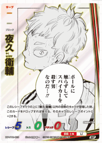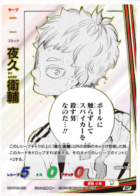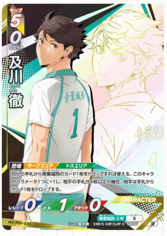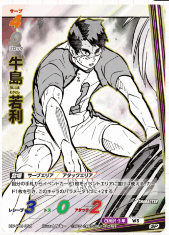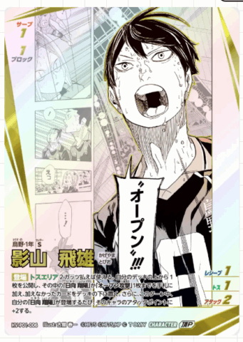 「ハイキュー!!バボカ!!BREAK」は、大人気TVアニメ『ハイキュー!!』の試合を手軽に体験できるカードゲームです。以前展開されていた「ハイキュー!!バボカ!!」からバージョンアップし、新しいシステムとカードで遊びの幅が広がりました。「サーブ」「レシーブ」「トス」「アタック」「ブロック」など、それぞれのキャラクターに合ったカードを駆使し、相手よりも先に3セット取得を目指します。本パックは映画でも大人気だった「ゴミ捨て場の決戦」をテーマにしています。